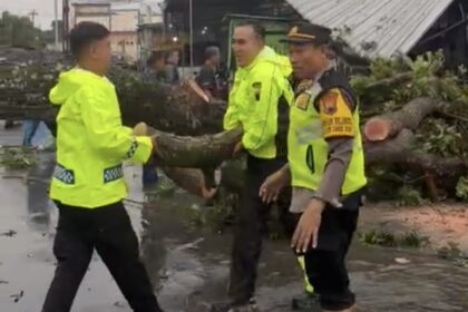 Personel Operasi Lilin Candi 2025 Polres Klaten bergerak cepat mengevakuasi pohon tumbang yang menutup akses Jalan Juwiring–Pedan, tepatnya di Desa Bulurejo, Kecamatan Juwiring, Kabupaten Klaten, Ming...
